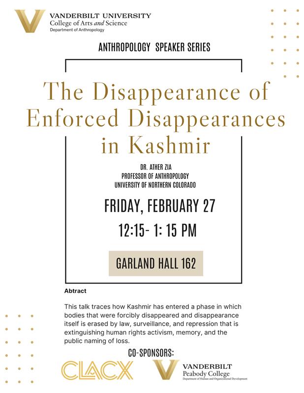 Feb. 13, 2026—Anthropological Conversations Speaker Series The Disappearance of Enforced Disappearances in Kashmir Dr. Ather Zia Professor of Anthropology University of Northern Colorado Friday, February 27 at 12:15 PM in Garland Hall 162